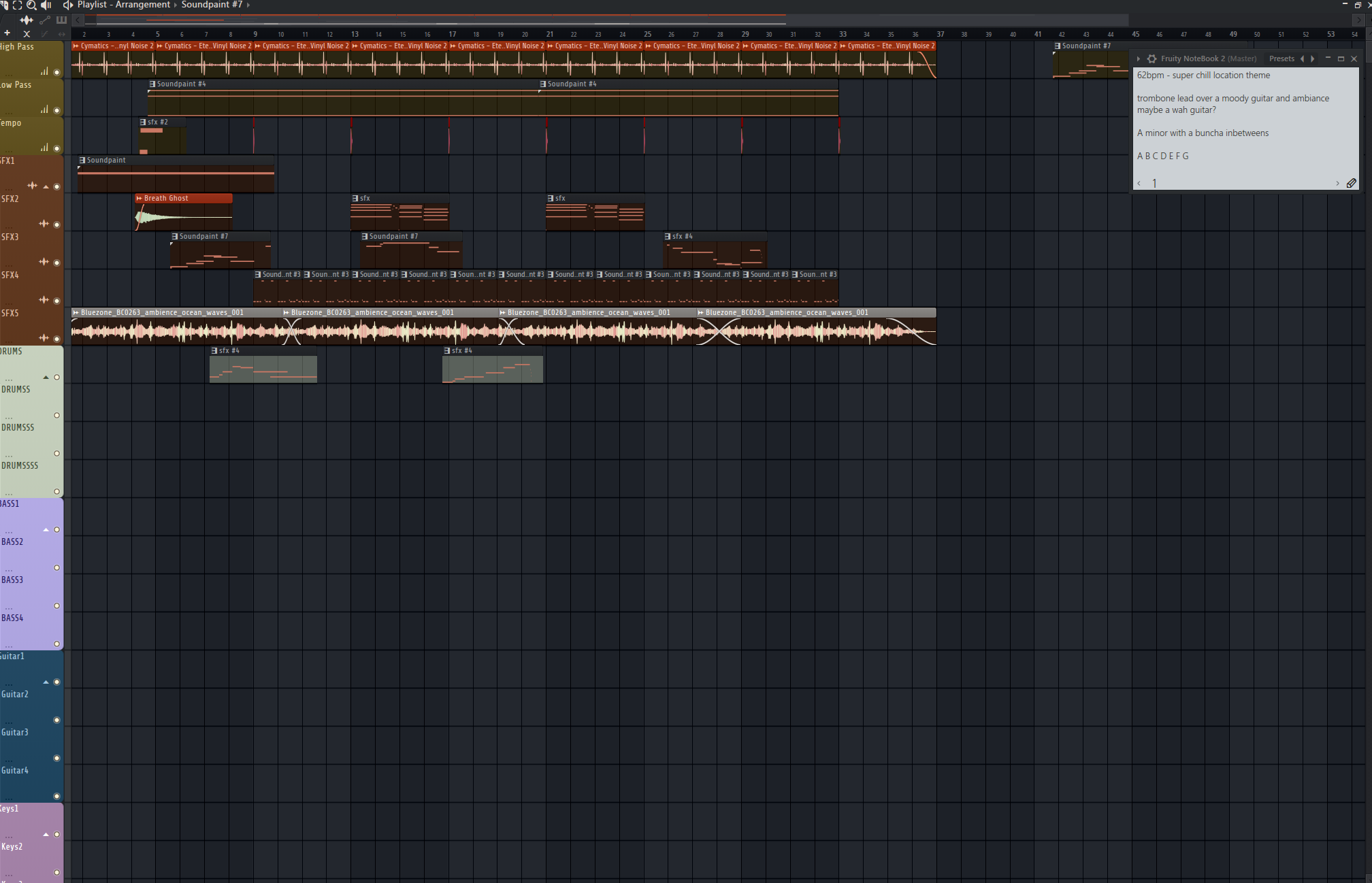I had in mind a crab-themed first enemy for training or regular battle purposes, so I decided that some surf-rock themed combat would be really interesting to make. I realized about halfway through I had ended up making a Teen Titans backing track, but I think that's what I was going for anyways lol. There's a bit of a story to this theme - 0:00 to 0:37 would be considered a prep section, so maybe there's a choice of settings before combat starts. I wrote it like you have to "turn on" your powers, so the drums double down once your powers start working smoothly. I wanted to use guitar resonance as a stand in for the newness of the MC's power control, so you're constantly adjusting the guitar overrun while in combat to tie in that feeling.